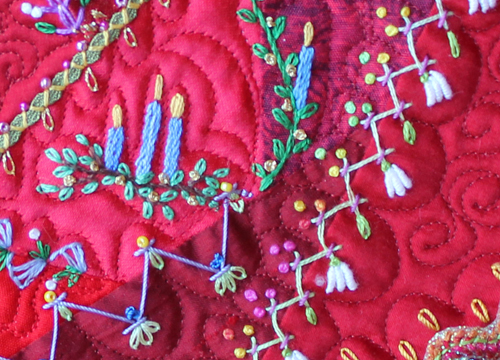 I used red silk fabrics to foundation piece the background and then started adding the motifs with hand embroidery.
